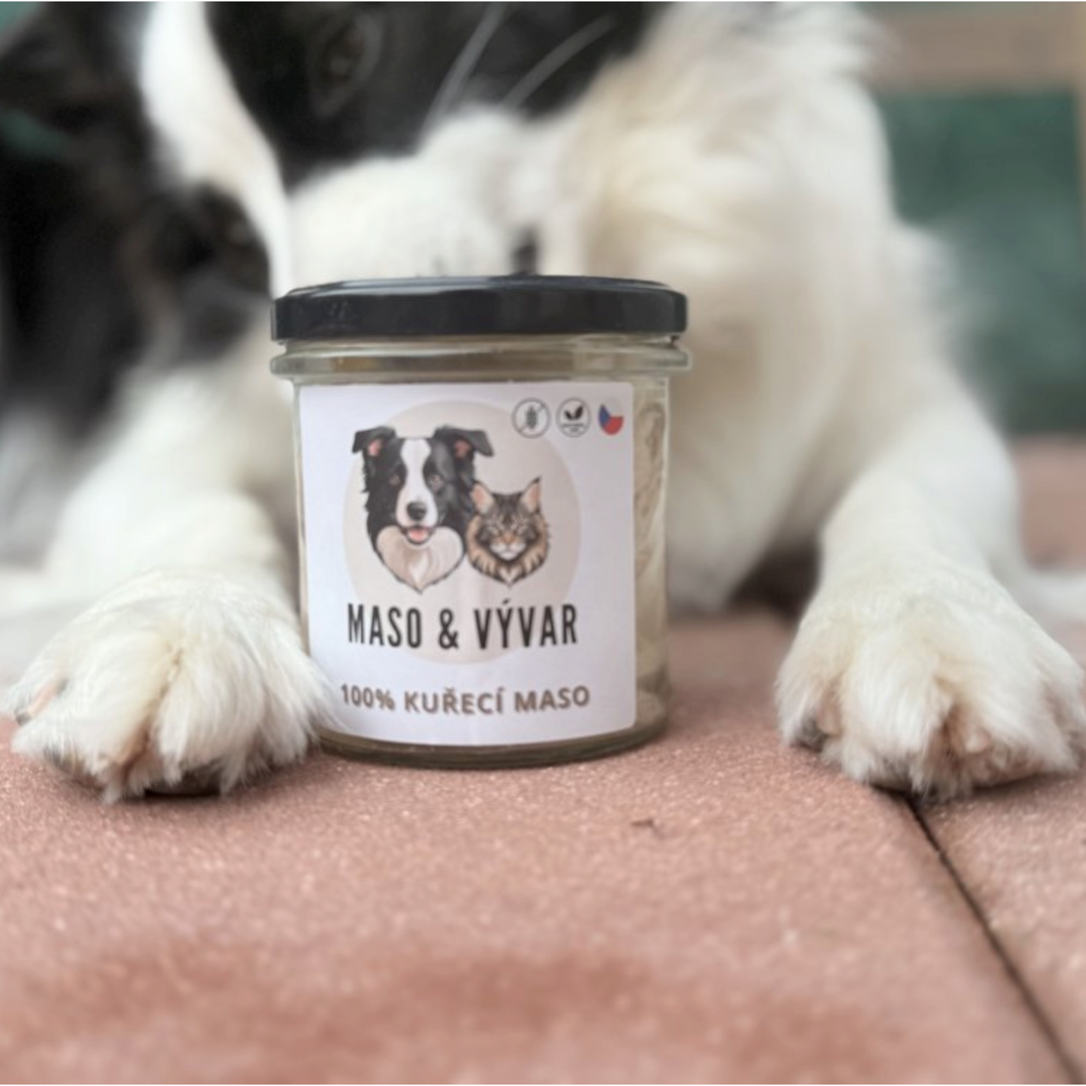 - Složení: Kuřecí maso, kuřecí vývar, přírodní kolagen.