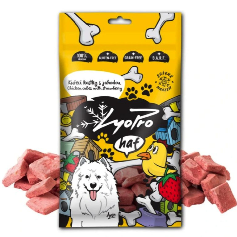 Mrazem sušené kuřecí kostky s jahodou patří mezi jedny z nejoblíbenějších psích pamlsků! Tyto mrazem sušené pamlsky pro psy jsou vyrobeny z pečlivě vybraných surovin, které zajišťují maximální kvalitu a čerstvost. Kombinace kuřecího masa a sladkých jahod poskytuje nejen lahodnou chuť, ale také bohatou výživu pro vašeho psa, jedná se totiž o neobyčejnou a návykovou kombinaci, kterou si zamilují psi všech plemen.