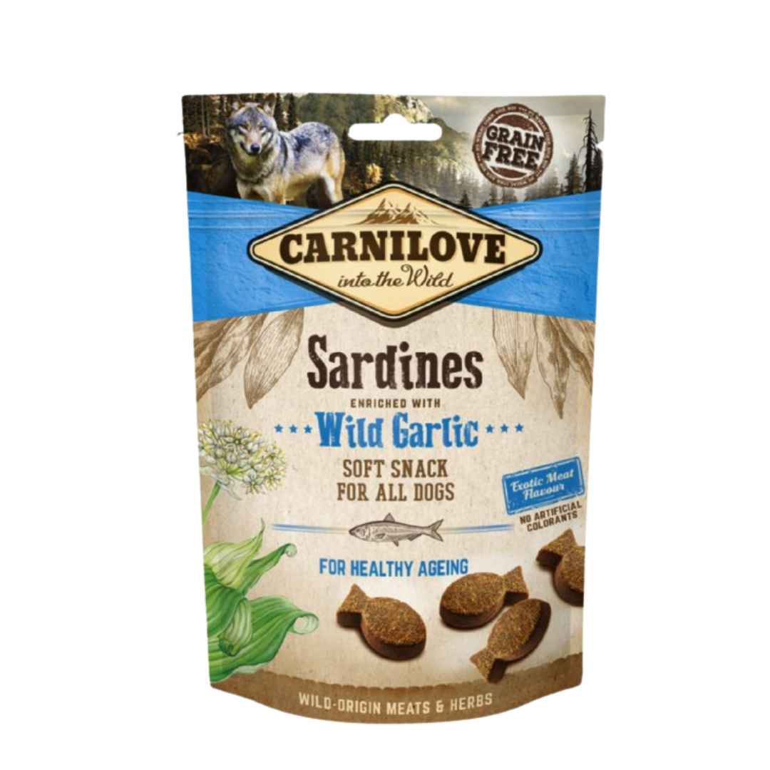 POLOMĚKKÉ PAMLSKY "CARNILOVE SEMI MOIST SNACK" SE SARDINKAMI A MEDVĚDÍM ČESNEKEM. LAHODNÁ KAŽDODENNÍ ODMĚNA PRO DOSPĚLÉ PSY VŠECH PLEMEN.