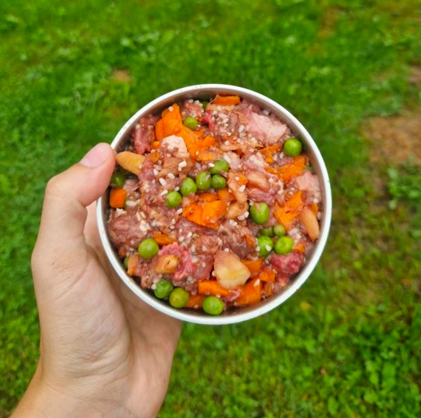Složení: Telecí hrubomletý ořez 50%, mrkev 10,5%, hovězí srdce 9%, hrášek 8%, rýže 7,2%, jablka 6,5%, hovězí játra 5%, hovězí plíce 2,5%, chia semínko 0,5%, lososový olej 0,5%, pivovarské kvasnice 0,3%