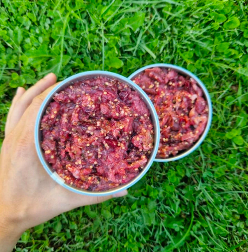 Složení: Vepřový hrubomletý ořez 50%, brokolice 11%, hovězí srdce 9%, řepa 7,5%, jáhly 7,2%, jablka 6,5%, hovězí játra 5%, hovězí plíce 2,5%, lněné semínko 0,5%, ostropestřecový olej 0,5%, pivovarské kvasnice 0,3%