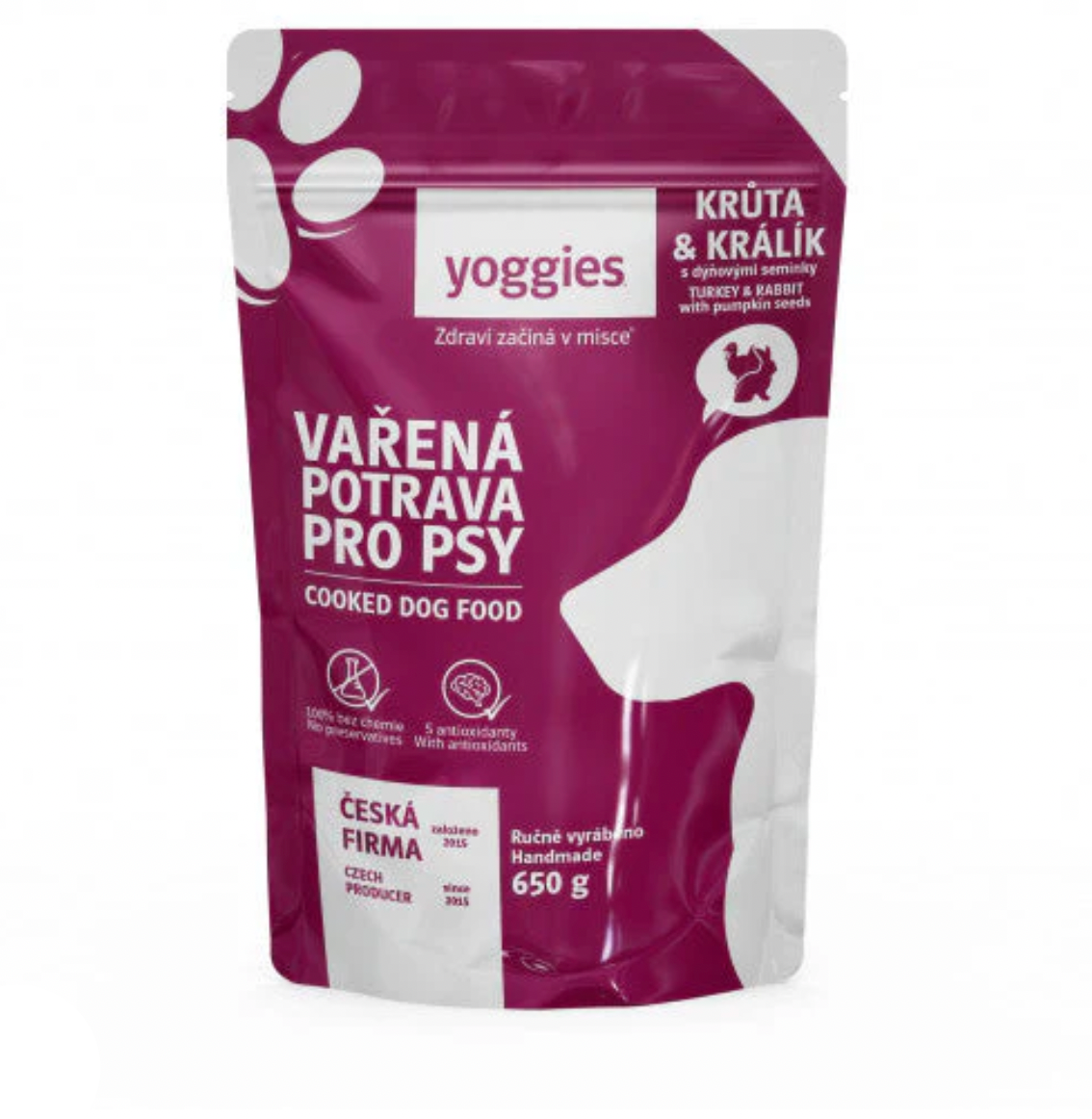 Yoggies Vařená potrava pro psy – krůtí a králičí maso s dýňovými semínky 650g
