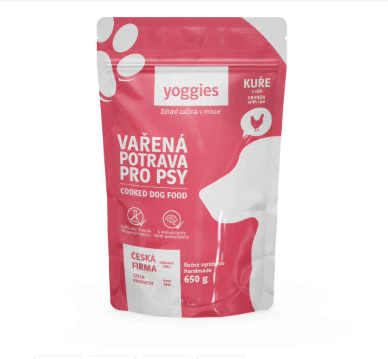Yoggies Vařená potrava pro psy – kuřecí maso s rýží 650g