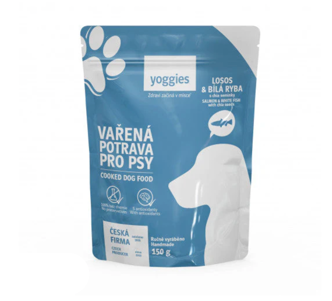 Yoggies Vařená potrava pro psy – losos a bílá ryba s chia semínky 150g