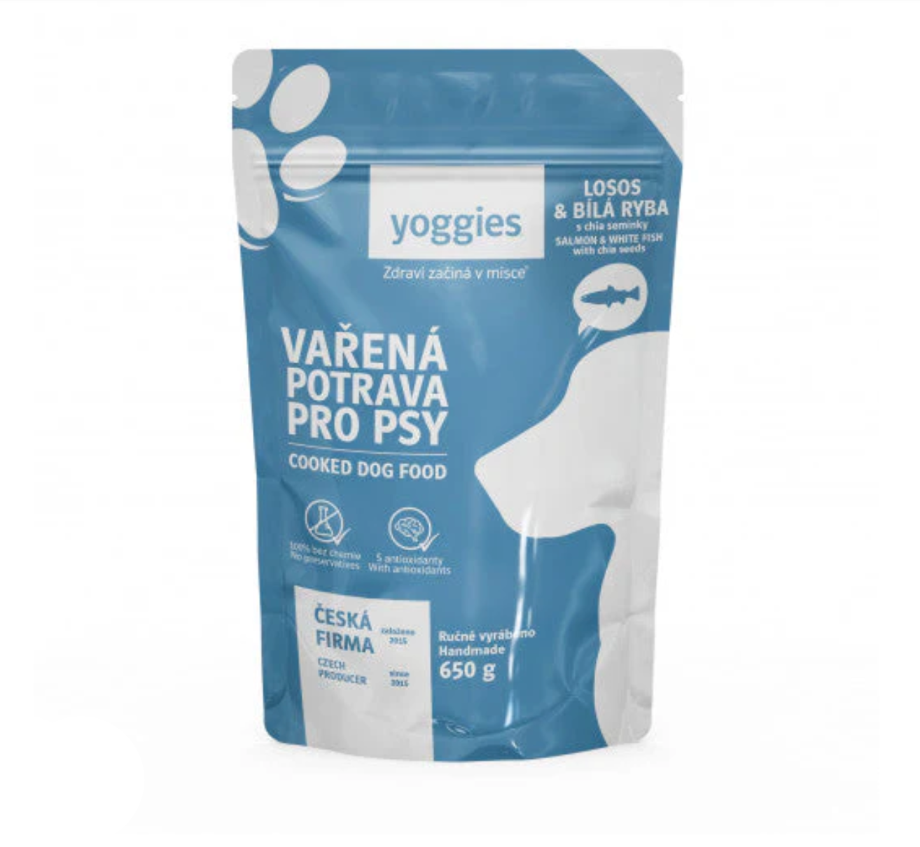 Yoggies Vařená potrava pro psy – losos a bílá ryba s chia semínky 650g
