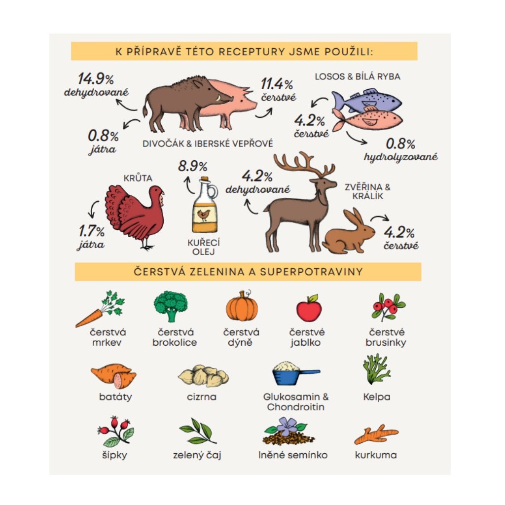 Složení: dehydrované iberské vepřové 14,9 %, dehydrované brambory, kuřecí olej (chráněno přírodními tokoferoly) 8,9 %, celý zelený hrášek, čerstvé vykostěné vepřové 7,2 %, bramborový škrob, dehydrovaná zvěřina 4,2 %, čerstvý losos 4,2 %, čerstvý vykostěný králík 4,2 %, čerstvý vykostěný divočák 4,2 %, celá cizrna 4,2 %, celý žlutý hrášek 4 %, jablečná vláknina, dehydrované sladké brambory 2,1 %, minerální látky, hydrolyzát z krůty 1,7 %, hydrolyzát z vepřových jater 0,8 %, hydrolyzát z ryb 0,8 %, lněné semínko (přírodní zdroj mastných kyselin ω3) 0,6 %, řepné řízky, kvasnice (Saccharomyces cerevisiae), čerstvá brokolice 1000 mg/kg, čerstvá dýně 1000 mg/kg, čerstvá jablka 1000 mg/kg, čerstvá mrkev 1000 mg/kg, glukosamin 1000 mg/kg, chondroitin 600 mg/kg, hydrolyzovaná buněčná stěna kvasnic (zdroj MOS) 500 mg/kg, čekanka (zdroj FOS) 500 mg/kg, výtažek z mandarinky 400 mg/kg, Yucca schidigera 200 mg/kg, řasa Kelpa 30 mg/kg, klikva celé plody 30 mg/kg, šípky (bohaté na vitamín C) 30 mg/kg, zelený čaj 30 mg/kg, kurkuma 30 mg/kg.