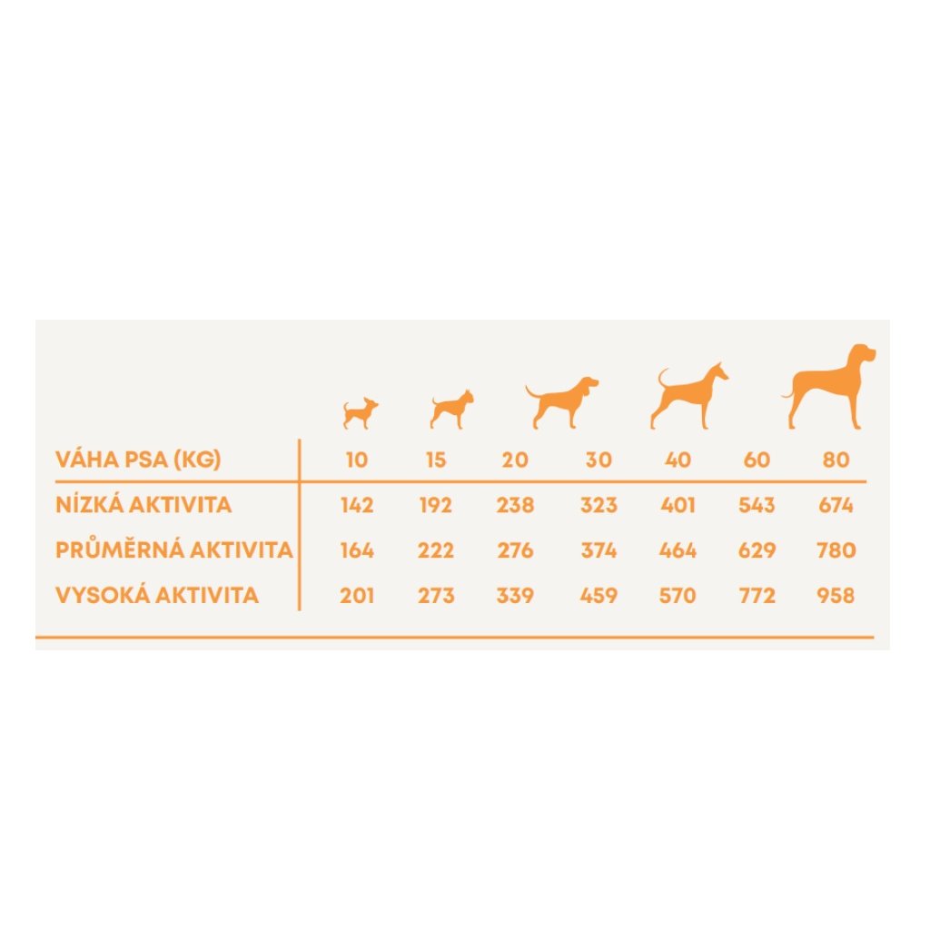 Krmný návod: změnu krmiva je třeba provádět postupně po dobu 7 dní. Jako návod použijte tabulku s dávkováním. Denní množství potravy se může pro každého psa lišit, záleží na úrovni jeho aktivity, plemeni a podmínkách prostředí. Denní krmnou dávku podávejte přednostně rozdělenou na 2 až 3 porce denně, a to vždy ve stejnou dobu. Pes musí mít vždy přístup k čisté, čerstvé vodě. Skladování: skladujte na chladném a suchém místě. Obal by měl být po použití vždy bezpečně uzavřen.