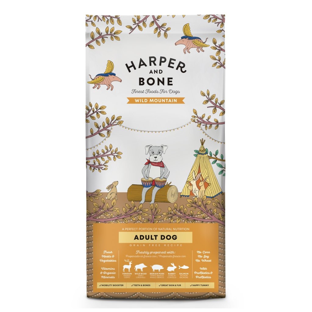 Harper and Bone Dog Adult Large & Medium divoké hory složené pouze z nejkvalitnějších surovin s vysokým podílem masa, přídavkem superpotravin a čerstvé zeleniny, zaručující prospěšné živiny a přirozenou chuť pro dokonale vyváženou výživu.