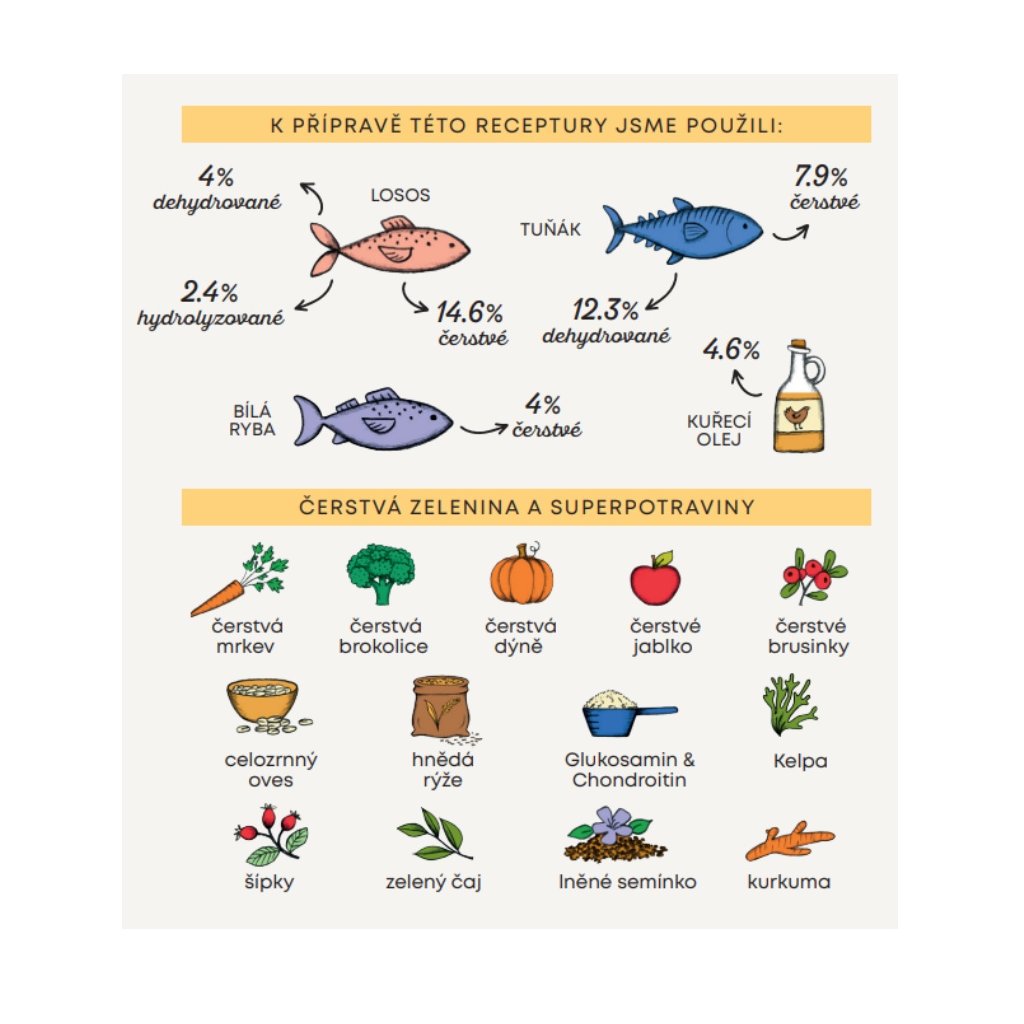Složení: čerstvý losos 14,6 %, extrudovaná rýže, dehydrovaný tuňák 12,3 %, celý zelený hrášek, čerstvý tuňák 7,9 %, celozrnná rýže 7,9 %, celozrnný ječmen 6,3 %, kuřecí olej (chráněno přírodními tokoferoly) 4,6 %, dehydrovaný losos 4 %, čerstvé bílé ryby 4 %, celozrnný oves 3,5 %, rýžový protein, lososový hydrolyzát 2,4 %, lněné semínko (přírodní zdroj mastných kyselin ω3) 0,5 %, řepné řízky, jablečná vláknina, kvasnice (Saccharomyces cerevisiae), minerální látky, čerstvá brokolice 1000 mg/kg, čerstvá dýně 1000 mg/kg, čerstvá jablka 1000 mg/kg, čerstvá mrkev 1000 mg/kg, glukosamin 1000 mg/kg, chondroitin 600 mg/kg, hydrolyzovaná buněčná stěna kvasnic (zdroj MOS) 500 mg/kg, čekanka (zdroj FOS) 500 mg/kg, výtažek z mandarinky 500 mg/kg, Yucca schidigera 200 mg/ kg, řasa Kelpa 30 mg/kg, klikva celé plody 30 mg/kg, šípky (bohaté na vitamín C) 30 mg/kg, zelený čaj 30 mg/kg, kurkuma 30 mg/kg.