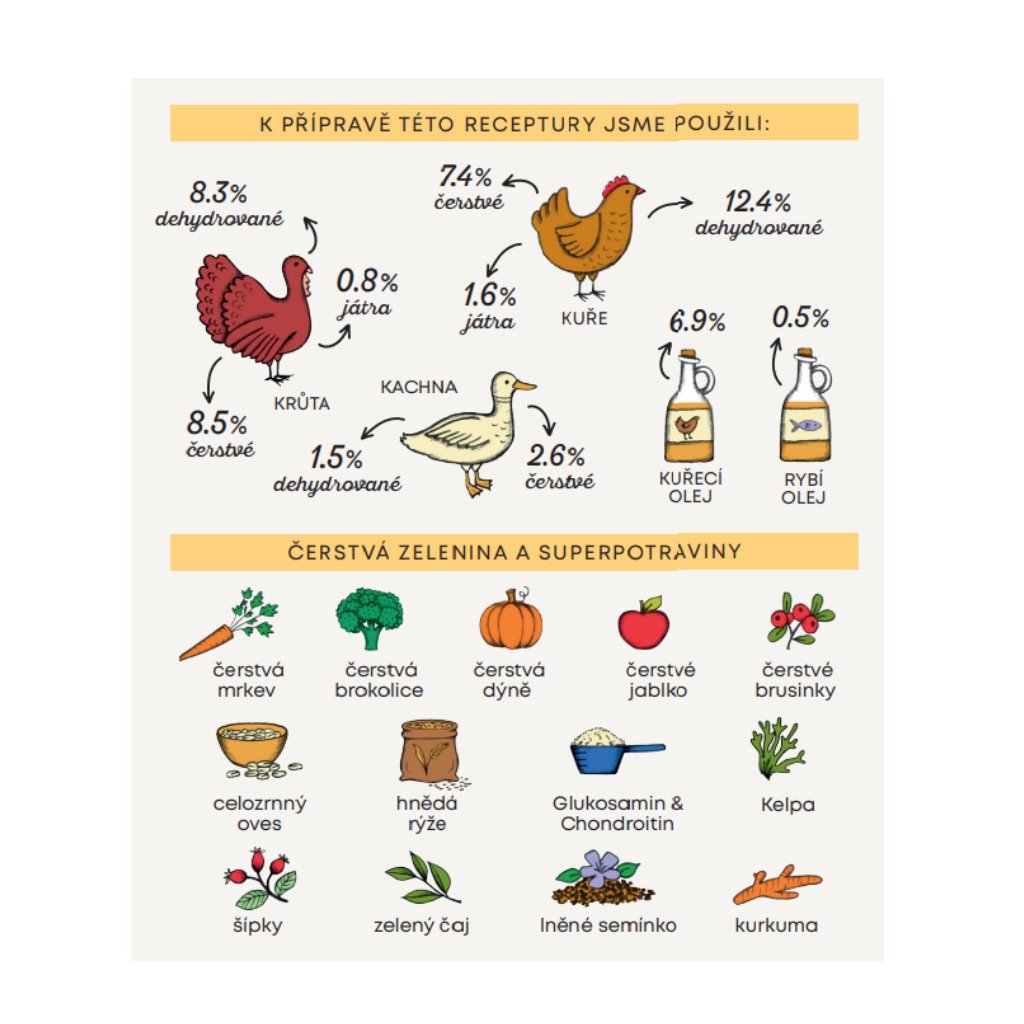 Složení: dehydrované kuřecí 12,4 %, čerstvá vykostěná krůta 8,5 %, extrudovaná rýže, celý zelený hrášek, dehydrovaná krůta, celozrnný oves 8,3 %, celozrnná rýže 8 %, kuřecí olej (chráněno přírodními tokoferoly) 6,9 %, celý žlutý hrášek, čerstvé vykostěné kuřecí 4,1 %, celozrnný ječmen 4,1 %, čerstvá kuřecí játra 3,3 %, čerstvá vykostěná kachna 2,6 %, hydrolyzát z kuřecích jater 1,6 %, dehydrovaná kachna 1,5 %, řepné řízky, jablečná vláknina, hydrolyzát z krůtích jater 0,8 %, minerální látky, lněné semínko (přírodní zdroj mastných kyselin ω3) 0,5 %, rybí olej (chráněno přírodními tokoferoly) 0,5 %, kvasnice (Saccharomyces cerevisiae), čerstvá brokolice 1000 mg/kg, čerstvá dýně 1000 mg/kg, čerstvá jablka 1000 mg/kg, čerstvá mrkev 1000 mg/kg, glukosamin 1000 mg/kg, chondroitin 600 mg/kg, hydrolyzovaná buněčná stěna kvasnic (zdroj MOS) 500 mg/kg, čekanka (zdroj FOS) 500 mg/kg, výtažek z mandarinky 400 mg/kg, Yucca schidigera 200 mg/ kg, Řasa Kelpa 30 mg/kg, klikva celé plody 30 mg/kg, šípky (bohaté na vitamín C) 30 mg/kg, zelený čaj 30 mg/kg, kurkuma 30 mg/kg.