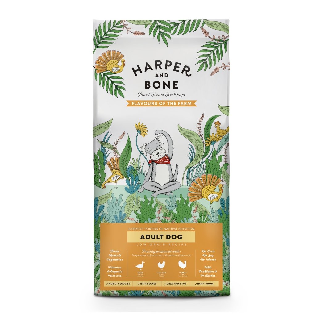Harper and Bone Dog Adult Large & Medium příchutě farmy složené pouze z nejkvalitnějších surovin s vysokým podílem masa, přídavkem superpotravin a čerstvé zeleniny, zaručující prospěšné živiny a přirozenou chuť pro dokonale vyváženou výživu.
