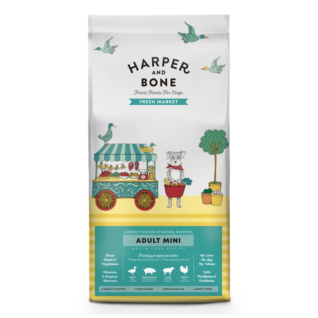 Harper and Bone Dog Adult Mini čerstvé z trhu složené pouze z nejkvalitnějších surovin s vysokým podílem masa, přídavkem superpotravin a čerstvé zeleniny, zaručující prospěšné živiny a přirozenou chuť pro dokonale vyváženou výživu.