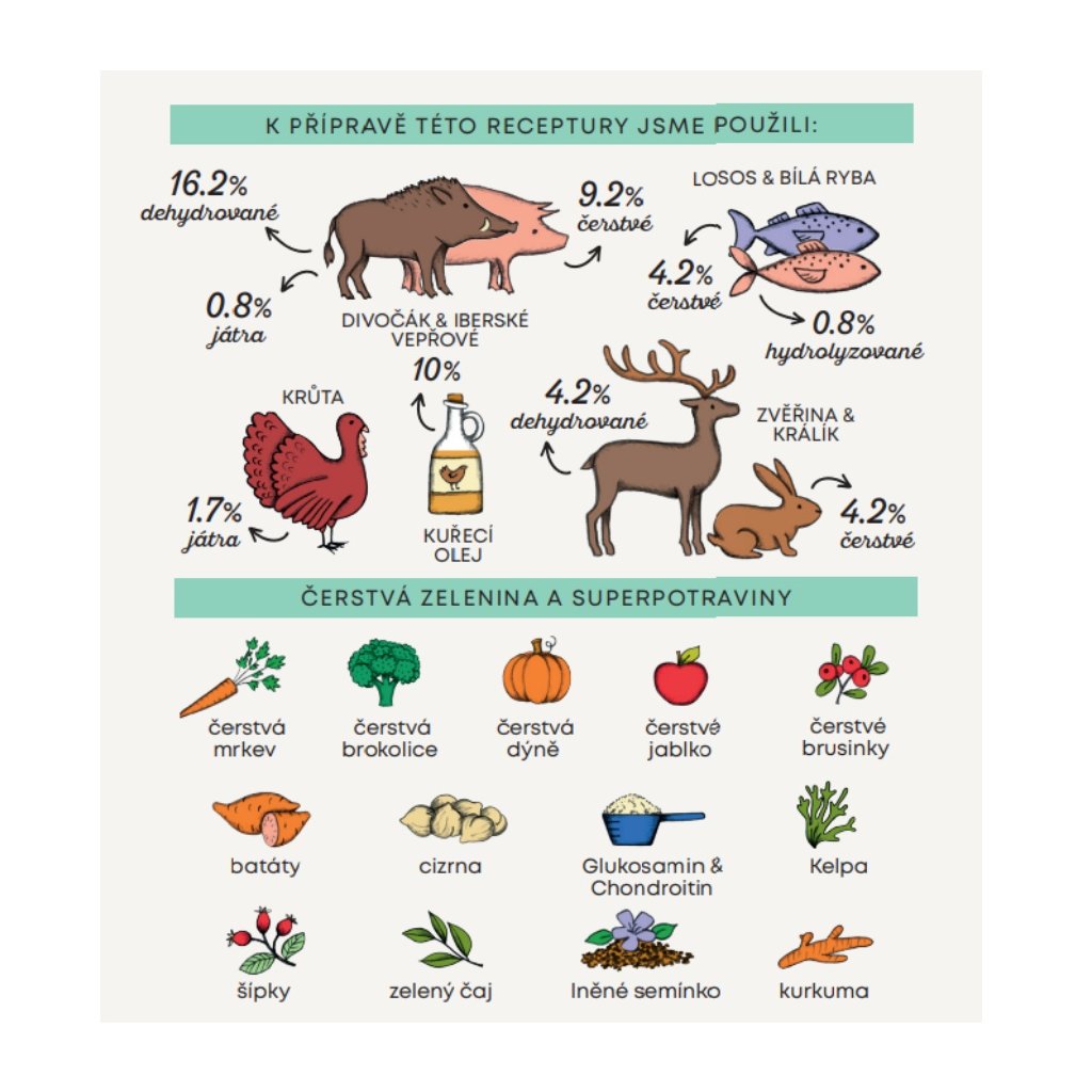 Složení: dehydrované iberské vepřové 16,2 %, dehydrované brambory, kuřecí olej (chráněno přírodními tokoferoly) 10 %, celý zelený hrášek, jablečná vláknina, čerstvé vykostěné vepřové 5 %, celý žlutý hrášek 4,3 %, dehydrovaná zvěřina 4,2 %, čerstvý losos 4,2 %, čerstvý vykostěný králík 4,2 %, čerstvý vykostěný divočák 4,2 %, celá cizrna 4,2 %, řepné řízky, dehydrované sladké brambory 2,1 %, minerální látky, hydrolyzát z krůtích jater 1,7 %, hydrolyzát z vepřových jater 0,8 %, hydrolyzát z ryb 0,8 %, lněné semínko (přírodní zdroj mastných kyselin ω3) 0,6 %, kvasnice (Saccharomyces cerevisiae), čerstvá brokolice 1000 mg/kg, čerstvá dýně 1000 mg/kg, čerstvá jablka 1000 mg/kg, čerstvá mrkev 1000 mg/kg, glukosamin 1000 mg/kg, chondroitin 600 mg/kg, hydrolyzovaná buněčná stěna kvasnic (zdroj MOS) 500 mg/kg, čekanka (zdroj FOS) 500 mg/kg, Yucca schidigera 200 mg/kg, řasa Kelpa 30 mg/kg, klikva celé plody 30 mg/kg, šípky (bohaté na vitamín C) 30 mg/kg, zelený čaj 30 mg/kg, kurkuma 30 mg/kg.
