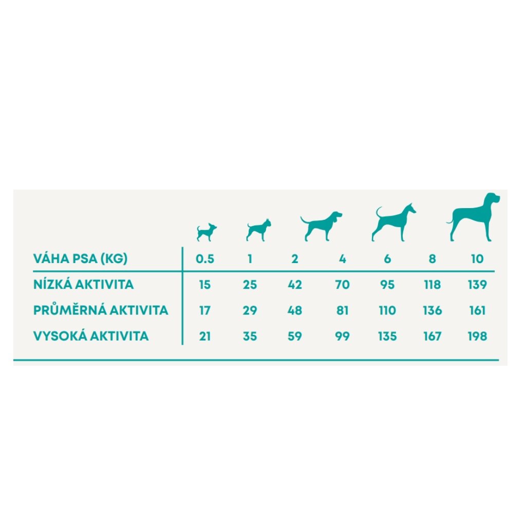 Krmný návod: změnu krmiva je třeba provádět postupně po dobu 7 dní. Jako návod použijte tabulku s dávkováním. Denní množství potravy se může pro každého psa lišit, záleží na úrovni jeho aktivity, plemeni a podmínkách prostředí. Denní krmnou dávku podávejte přednostně rozdělenou na 2 až 3 porce denně, a to vždy ve stejnou dobu. Pes musí mít vždy přístup k čisté, čerstvé vodě. Skladování: skladujte na chladném a suchém místě. Obal by měl být po použití vždy bezpečně uzavřen.