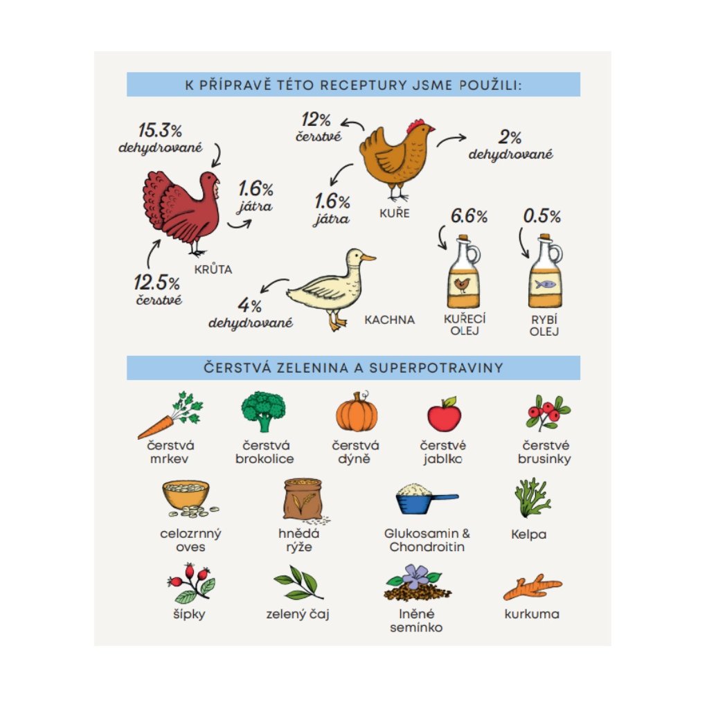 Složení: dehydrovaná krůta 15,3 %, čerstvé vykostěné kuřecí maso 12 %, celý zelený hrášek, extrudovaná rýže, čerstvá krůtí játra, celozrnná rýže 8,5 %, celozrnný ječmen 8 %, kuřecí olej (chráněno přírodními tokoferoly) 6,6 %, dehydrovaná kachna 4 %, čerstvá vykostěná krůta 4 %, celozrnný oves 3,4 %, dehydrované kuřecí 2 %, hydrolyzát z kuřecích jater 1,6 %, hydrolyzát z krůtích jater 1,6 %, lněné semínko (přírodní zdroj mastných kyselin ω3) 0,5 %, řepné řízky, jablečná vláknina, rybí olej (chráněno přírodními tokoferoly) 0,5 %, kvasnice (Saccharomyces cerevisiae), minerální látky, čerstvá brokolice 1000 mg/kg, čerstvá dýně 1000 mg/kg, čerstvá jablka 1000 mg/kg, čerstvá mrkev 1000 mg/kg, glukosamin 1000 mg/kg, chondroitin 600 mg/kg, hydrolyzovaná buněčná stěna kvasnic (zdroj MOS) 500 mg/kg, čekanka (zdroj FOS) 400 mg/kg, výtažek z mandarinky 400 mg/kg, Yucca schidigera 200 mg/kg, Řasa Kelpa 30 mg/kg, klikva celé plody 30 mg/kg, šípky (bohaté na vitamín C) 30 mg/kg, zelený čaj 30 mg/kg, kurkuma 30 mg/kg.