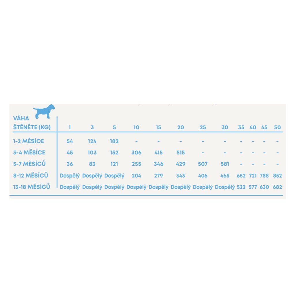 Krmný návod: změnu krmiva je třeba provádět postupně po dobu 7 dní. Po odstavení krmte 4 x až 5 x za den. Do 4 měsíců věku smícháním s teplou vodou v poměru 1 díl vody a 3 díly krmiva. Odstraňte zbytky krmiva. Štěněti okolo 1 roku postupně snižujte počet krmných dávek až na 2 za den. Pes musí mít vždy přístup k čisté, čerstvé vodě. Skladování: skladujte na chladném a suchém místě. Obal by měl být po použití vždy bezpečně uzavřen.