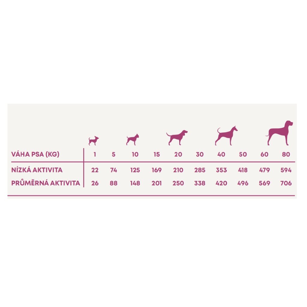 Krmný návod: změnu krmiva je třeba provádět postupně po dobu 7 dní. Jako návod použijte tabulku s dávkováním. Denní množství potravy se může pro každého psa lišit, záleží na úrovni jeho aktivity, plemeni a podmínkách prostředí. Denní krmnou dávku podávejte přednostně rozdělenou na 2 až 3 porce denně, a to vždy ve stejnou dobu. Pes musí mít vždy přístup k čisté, čerstvé vodě. Skladování: skladujte na chladném a suchém místě. Obal by měl být po použití vždy bezpečně uzavřen.