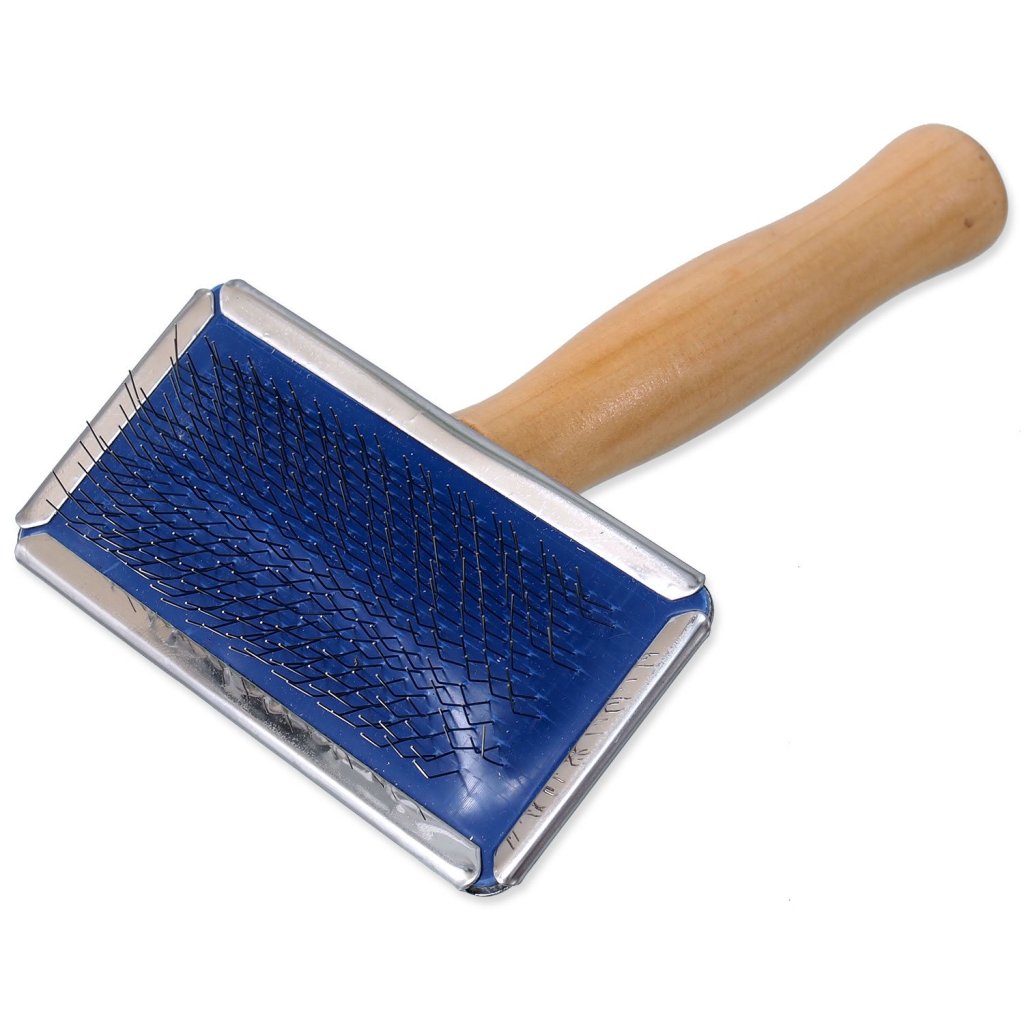 Kartáč s kovovými drátky a dřevěnou rukojetí pro střední psy.