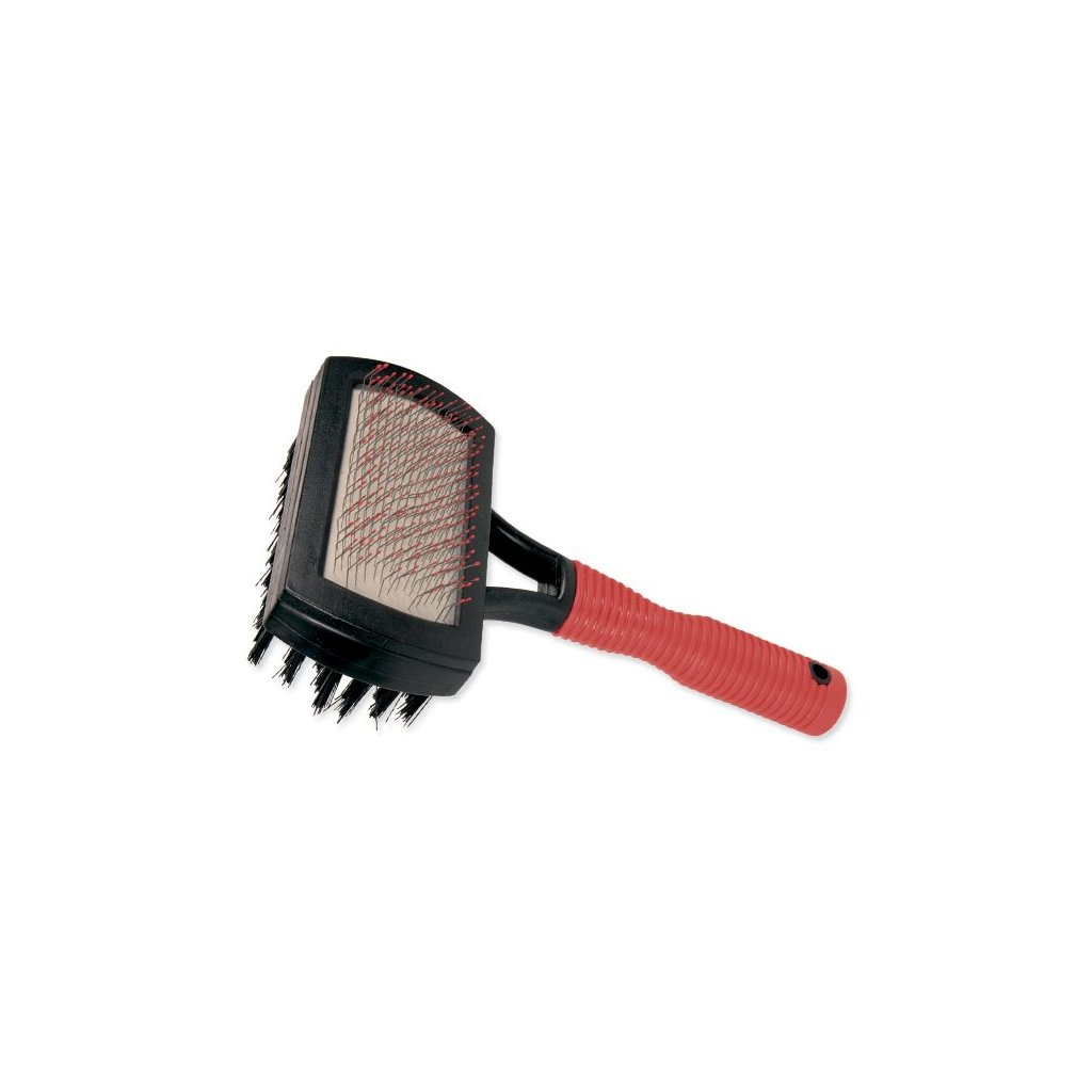 Oboustranný kartáč s gumovou rukojetí pro psy. Vhodný pro psy s dlouhou, krátkou, kudrnatou a hrubou srstí. Péči o srst zvládnete jedním kartáčem. Odstraníte odumřelou srst a zároveň vyčešete prach.