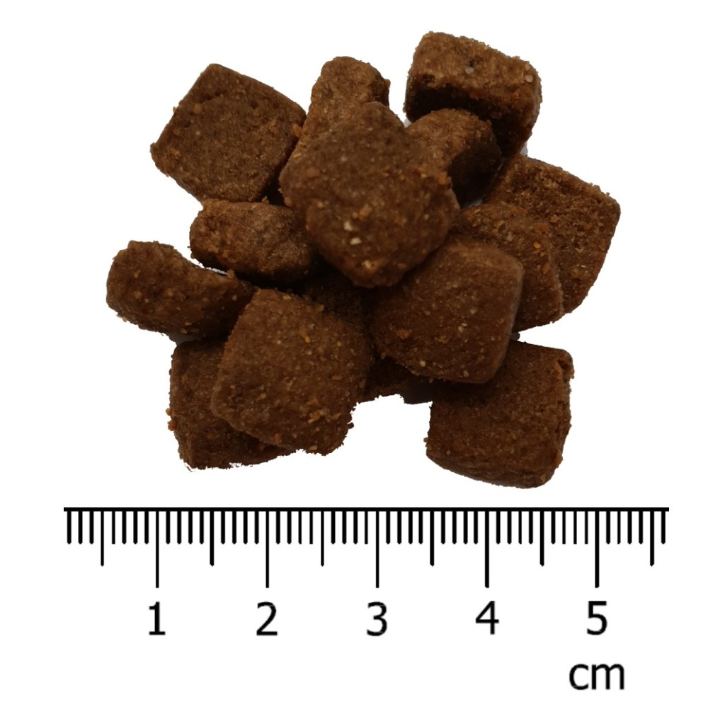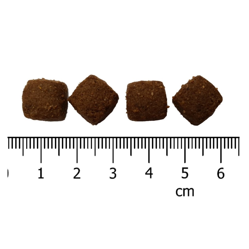 Analytické složky: Protein 29 %, hrubý tuk 18 %, hrubá vláknina 3,5 %, hrubý popel 7,5 %, vápník 1,2 %, fosfor 0,9 %, vlhkost 10 %.
