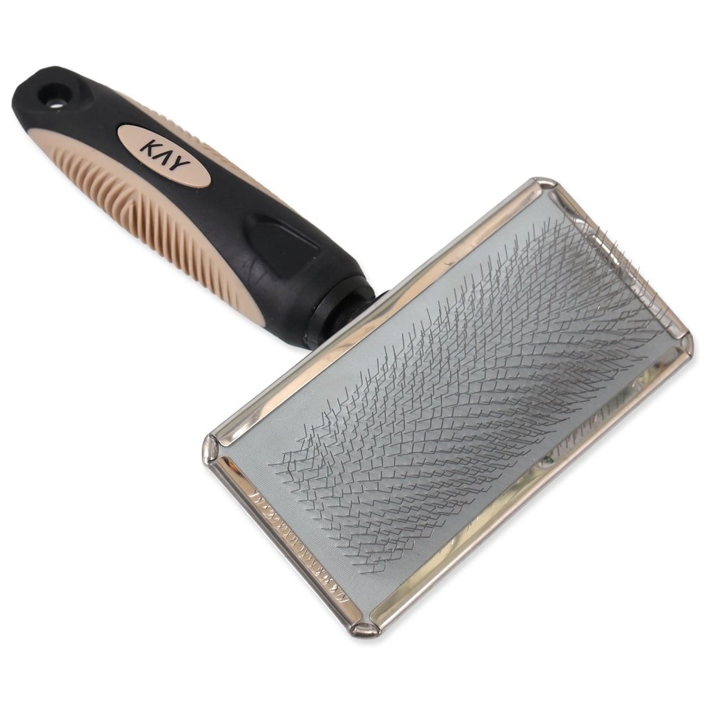 Jednostranný kartáč pro střední psy s příjemně tvarovanou plastovou rukojetí a jemnými drátěnými štětinami.