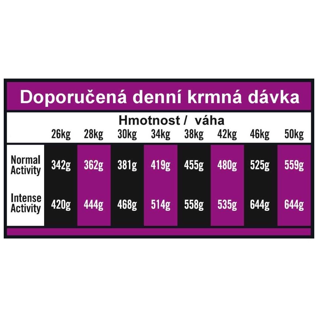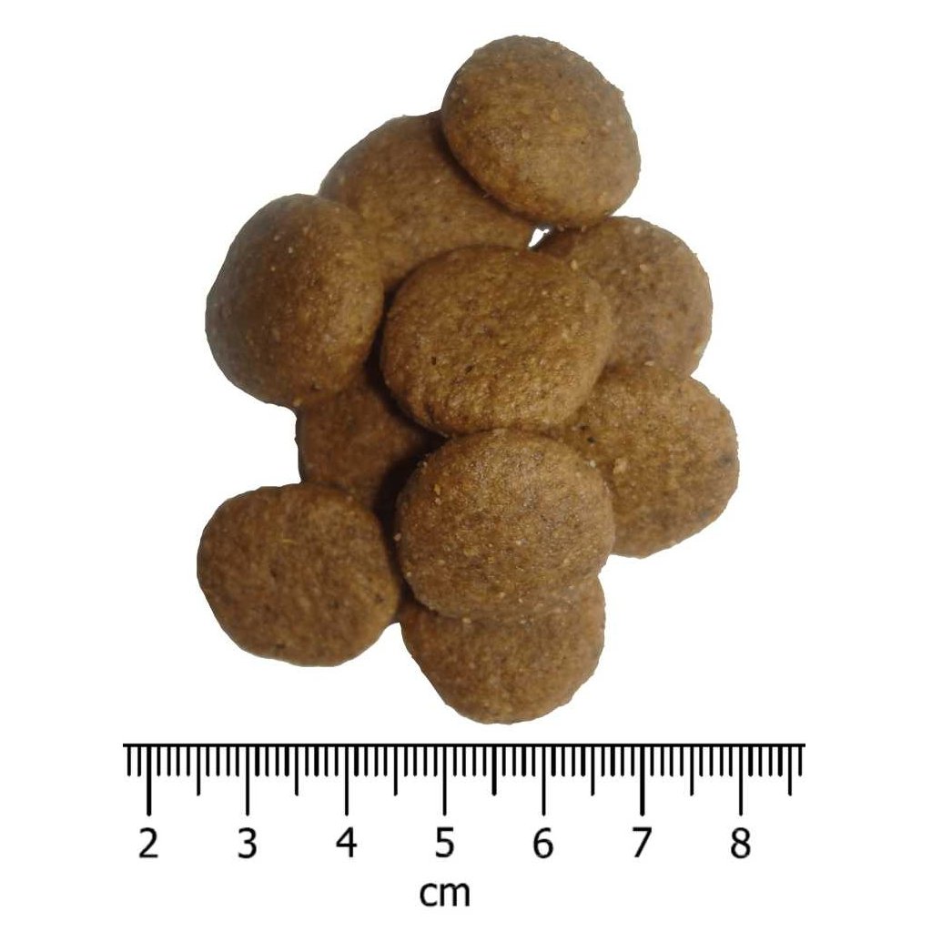 Analytické složky: Hrubý protein 25 %, hrubý olej a tuky 16 %, mastné kyseliny omega 6: 3,60 %, EPA+DHA 920 mg / kg, hrubá vláknina 2,75 %, hrubý popel 8 %, vápník 1,35 %, fosfor 1,05 %.