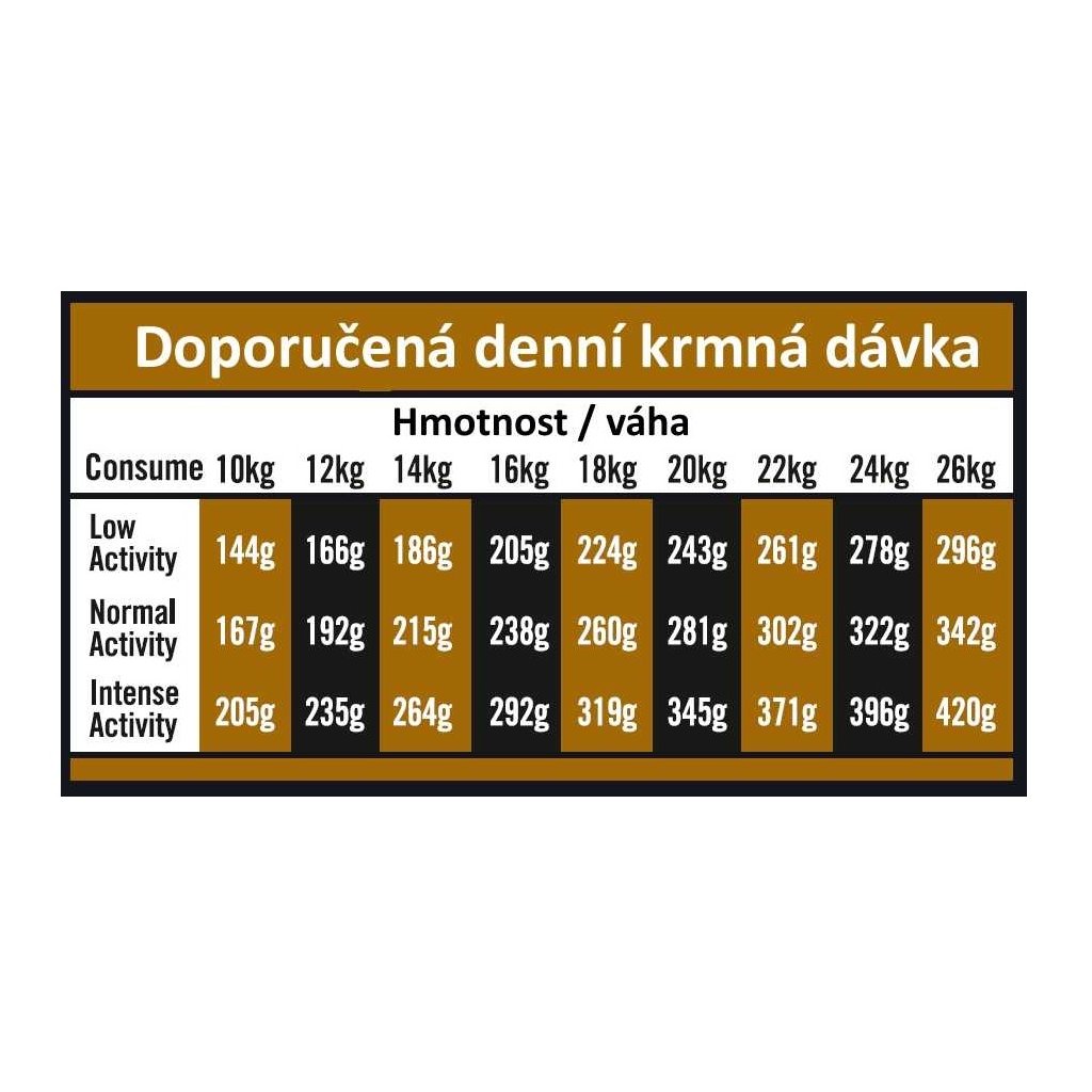 Analytické složky: Hrubý protein 26 %, hrubý olej a tuky 16 %, EPA+DHA 500 mg / kg, hrubá vláknina 2,75 %, hrubý popel 8 %, vápník 1,35 %, fosfor 0,95 %.