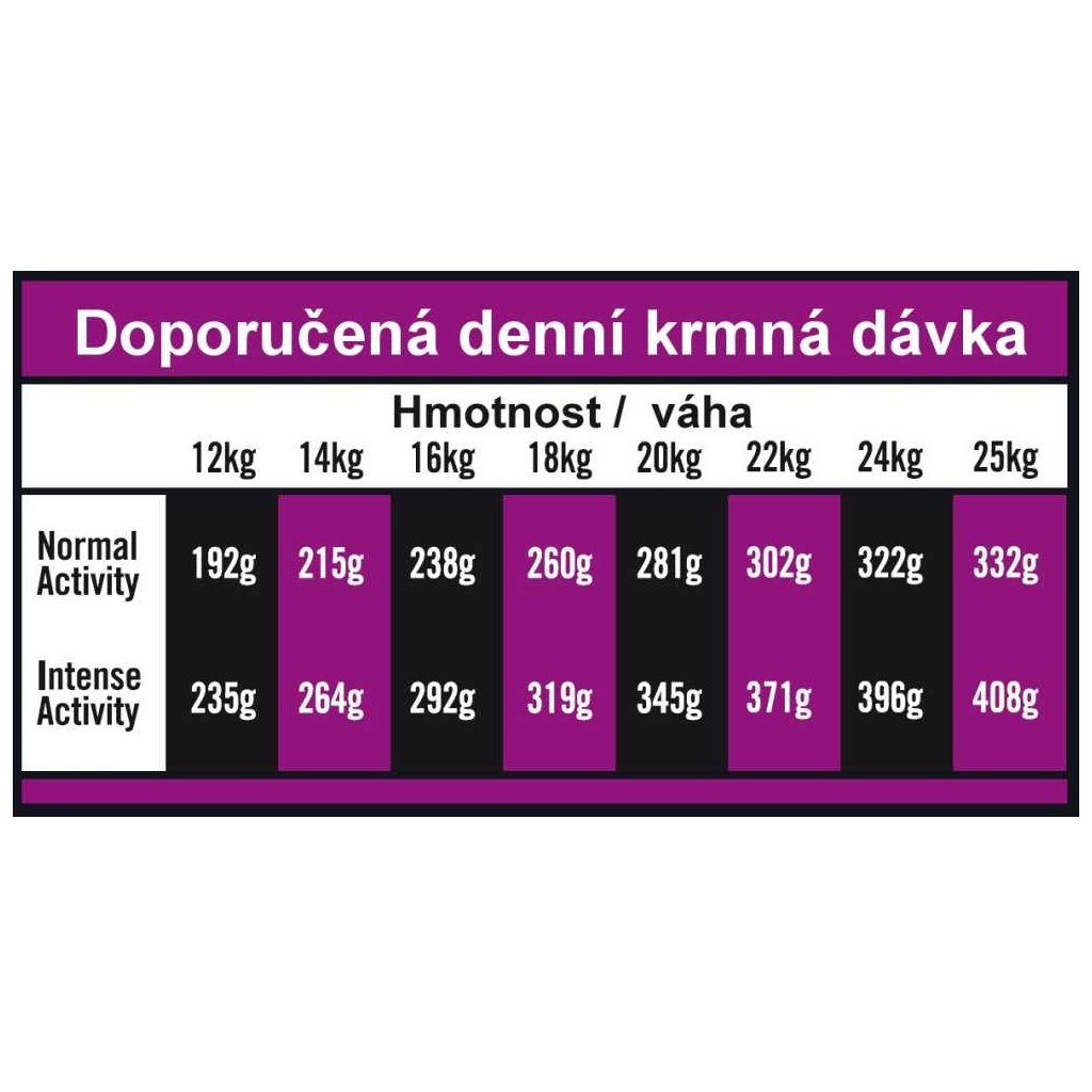 Analytické složky: Hrubý protein 26 %, hrubý olej a tuky 16 %, EPA+DHA 770 mg / kg, hrubá vláknina 2,5 %, hrubý popel 8 %, vápník 1,35 %, fosfor 0,95 %.