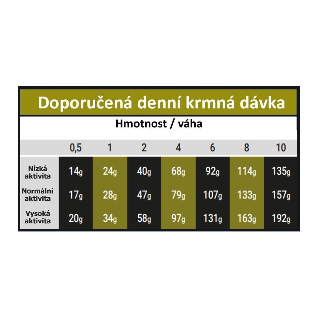 Analytické složky: hrubý protein 30 %, hrubý olej a tuky 18 %, EPA+DHA 400 mg / kg, Omega-3 mastné kyseliny 0,50 %, Omega-6 mastné kyseliny 1,45 %, hrubá vláknina 3,50 %, hrubý popel 7,5 %, vápník 1,70 %, fosfor 1,00 %. Metabolizovatelná energie: 3 947 kcal/kg.