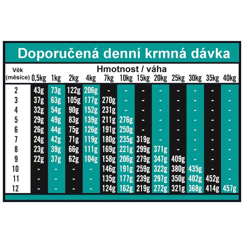 Analytické složky: Hrubý protein 29 %, hrubý olej a tuky 22 %, EPA+DHA 5300 mg / kg, hrubá vláknina 2,50 %, hrubý popel 7,5 %, vápník 1,25 %, fosfor 1,05 %.