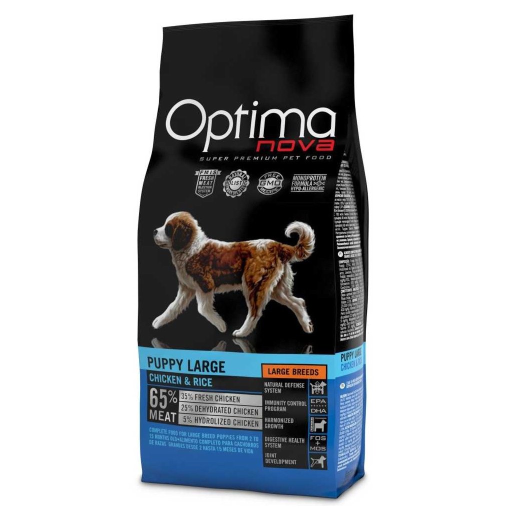 OPTIMAnova Dog Puppy Large Chicken & Rice složené z kvalitních bílkovin a lehce stravitelných sacharidů v kombinaci s prospěšnými tuky. Krmivo obohacené o vitamíny, minerální látky a antioxidanty.