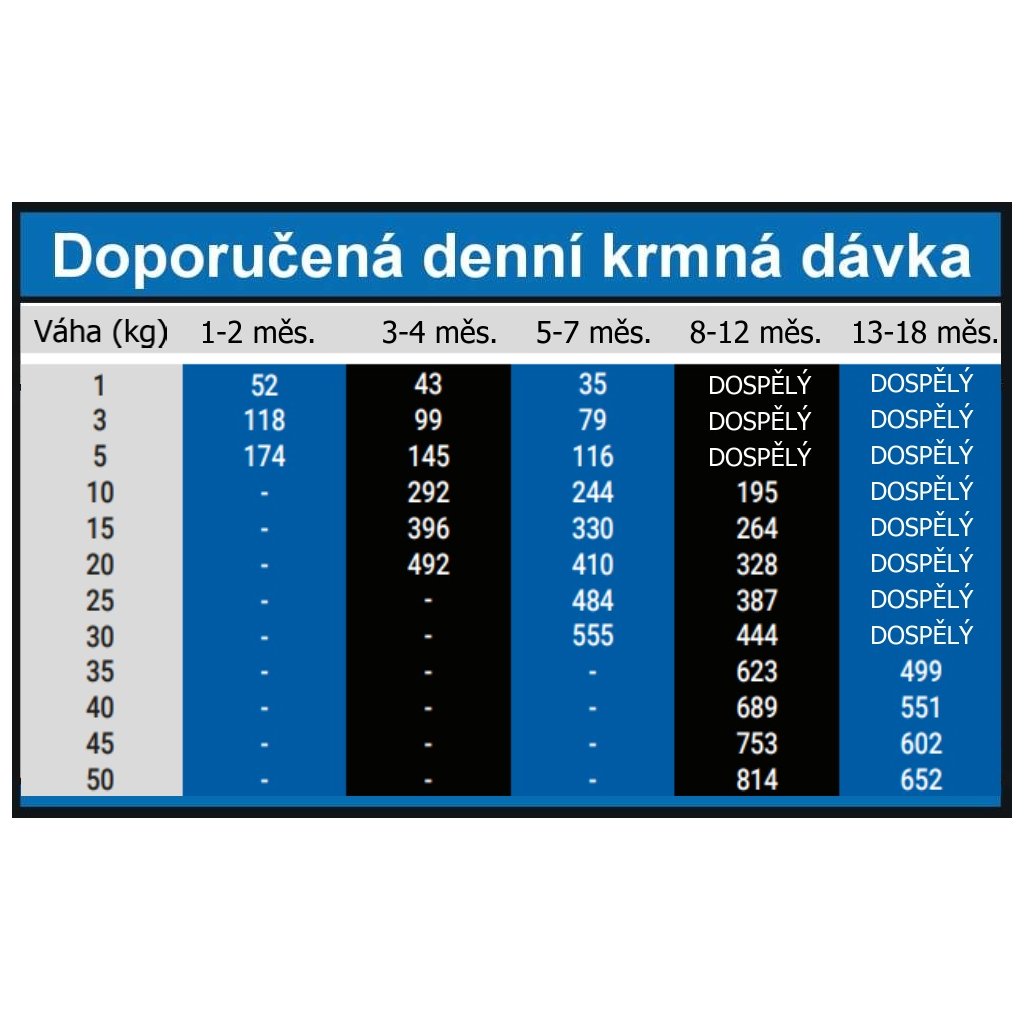 Analytické složky: Hrubý protein 30,00 %, hrubé tuky 20,00 %, EPA + DHA 500 mg/kg, omega-3 mastné kyseliny 0,40 %, omega-6 mastné kyseliny 3,90 %, hrubá vláknina 2,50 %, hrubý popel 8,00 %, vápník 1,45 %, fosfor 1,20 %. Metabolizovatelná energie 4 040 kcal/kg.