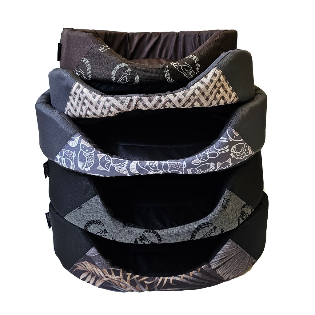 Látkový pelíšek pro psy ve tvaru oválu s vyjímatelnou podložkou.