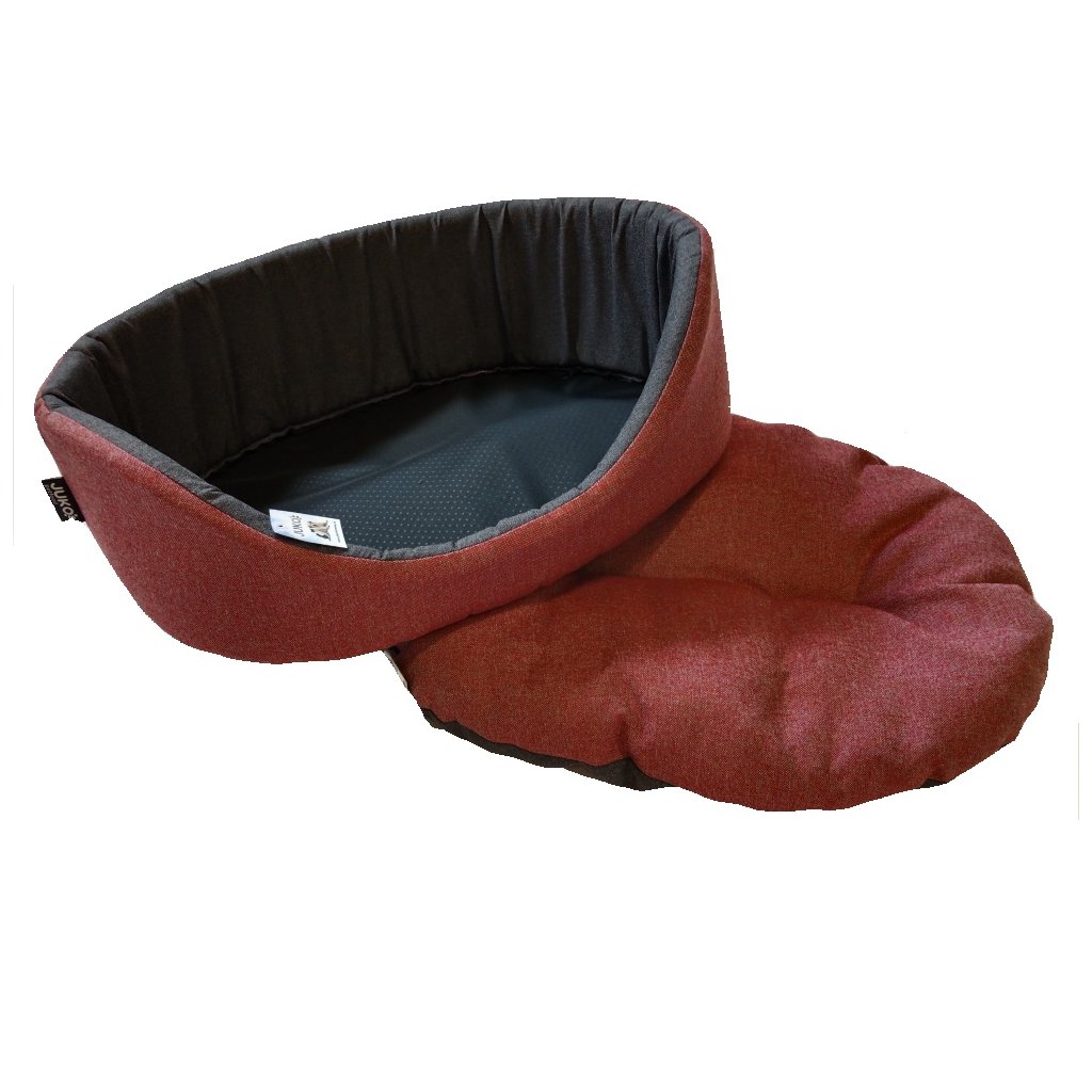 Látkový pelíšek pro psy ve tvaru oválu s vyjímatelným polštářkem.