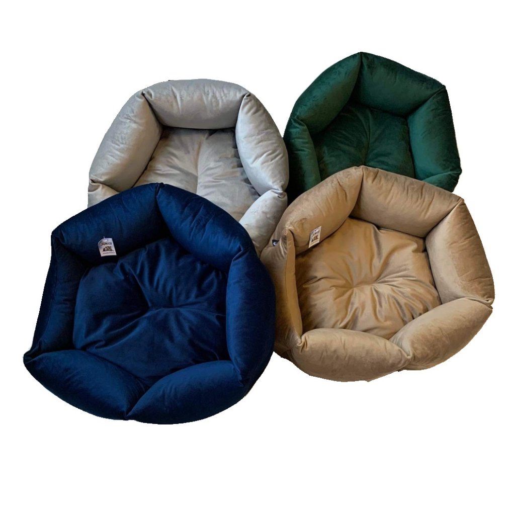 Luxusní sametový pelíšek ve tvaru korunky pro psy s polstrovaným okrajem.