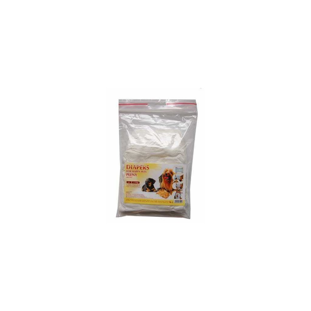 Pro jednorázové použití. Plena má dobře držící opakovaně použitelné upínací pásky které jsou upravovány tak aby se nezachytávala srst zvířete k lepící části upínacího pásku. Možné použít přes den i na noc.